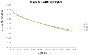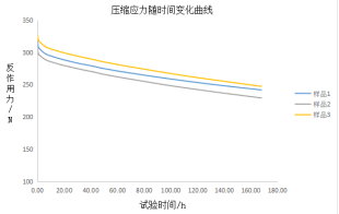 以橡胶压缩应力松弛试验为例,试样一般选择圆柱形试样,在规定的温度下,将橡胶试样压缩到某一恒定应变并保存该应变的状态下,测量压缩力的降低,记录应力随时间变化曲线。