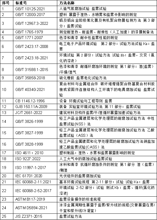 盐雾相关试验方法如下表: