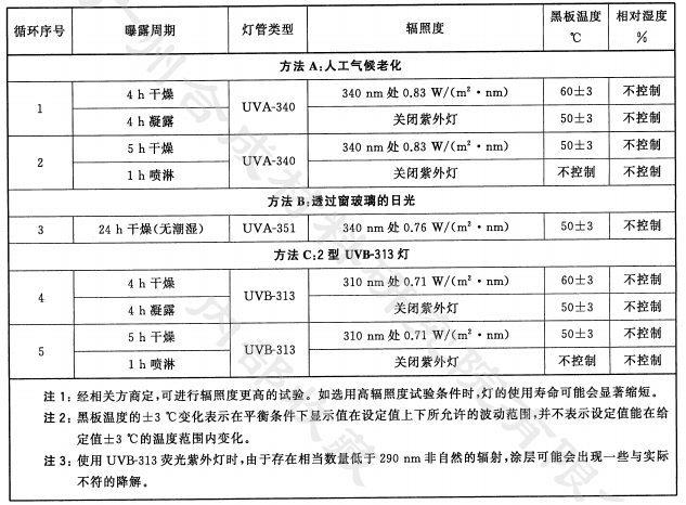 • 辐照度:推荐了特定波长下的辐照度控制点(例如,UVA-340灯在340 nm处建议为0.83 W/(m²·nm)),并强调可使用辐照计进行监控。