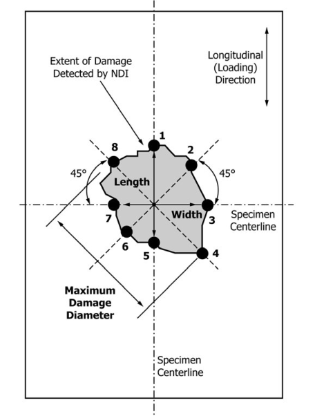 3、损伤评估:冲击后,需使用超声等无损检测(NDI)方法量化损伤区域,测量其长度、宽度及最大损伤直径,损伤程度测量如图2。